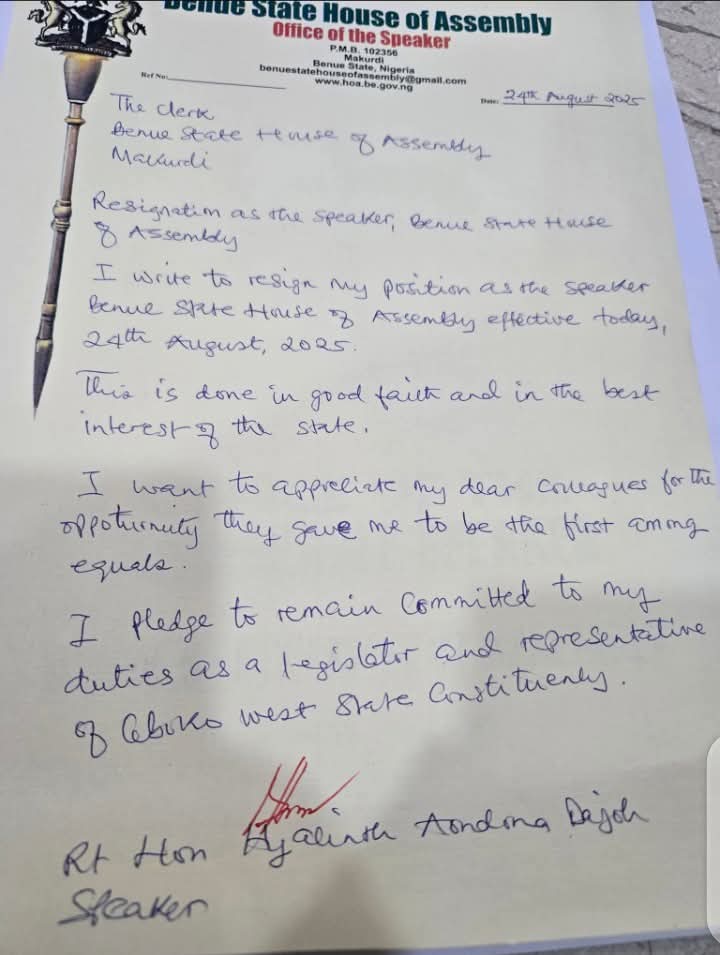 Benue State House of Assembly, Speaker Rt Hon. Hyacinth Aondona Dajoh, has stepped down as the speaker of the 10th Assembly.